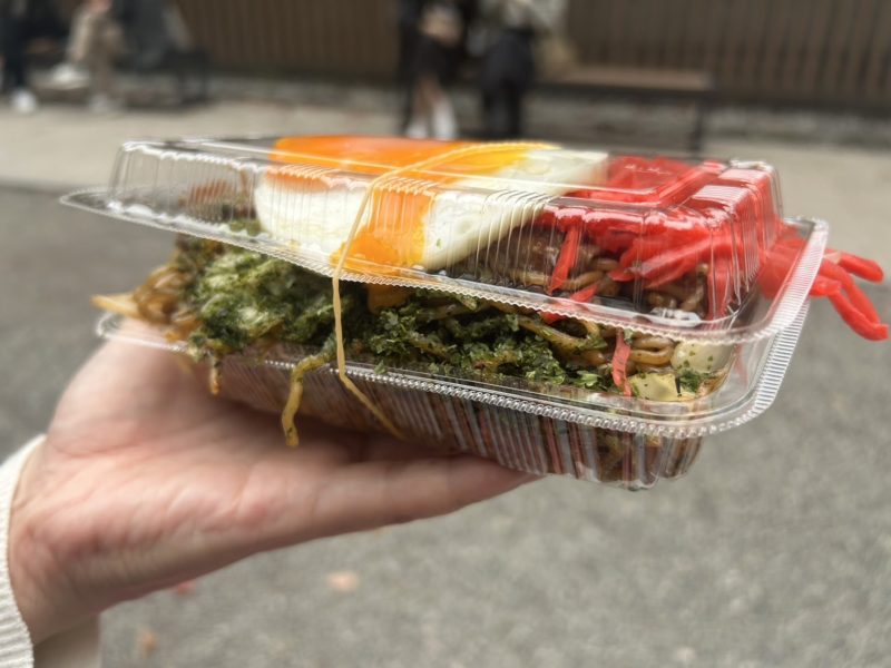 この焼きそばすごくないですか!山盛りも山盛りですよ。蓋閉まってないし、紅ショウガははみ出ているし。蓋で目玉焼きはつぶれてるし。肉もいっぱい乗っかてる。