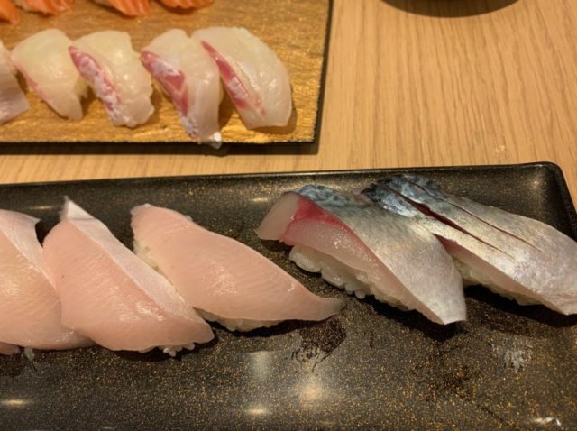 実家の近くの回転すしです。福岡県の生サバはこんな感じです。