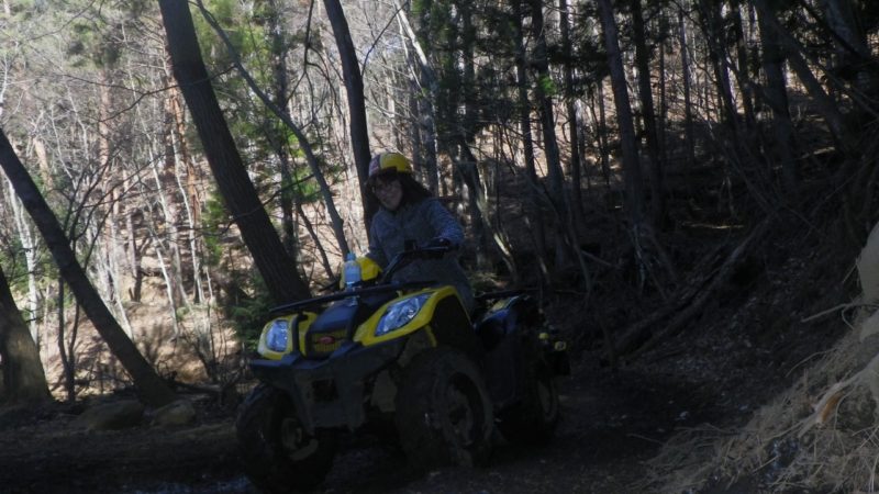 バギーとは4輪バイクです。林道を駆け上ります。石、水たまり、丸太などなんでも登ります。の、はずです。体験したかったのは私。「もっと楽しんで~」「こわくないよ」「おもいきってみようか」「かたいよー」「リラックスして~」これすべて私に投げかけられたお言葉。めちゃ楽しんでいるのよ。でもトラクターのようなスピードしか出せないのよ。トラクターのようなスピードだけど本人的にはすこぶる楽しいのよ。