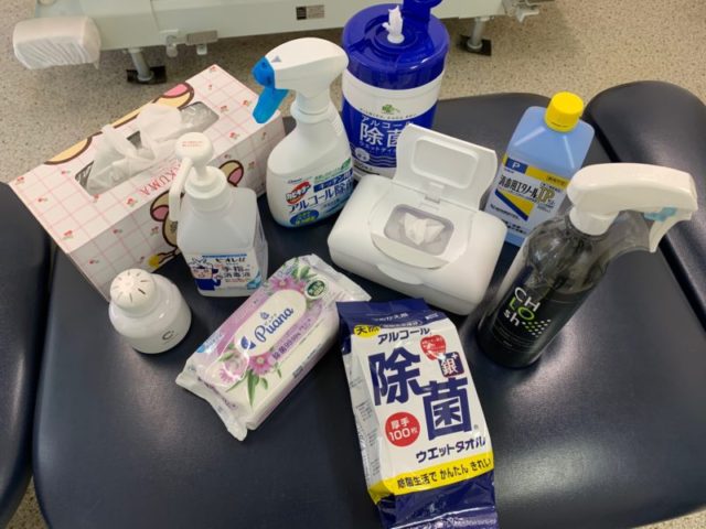 私のコロナウイルス対策の全財産です。と3月に撮った写真ですがアルコール除菌スプレーはなくなりました。それから次亜塩素酸水はたくさんあります。アルボナース消毒水を手にいれました。除菌しまくってます。