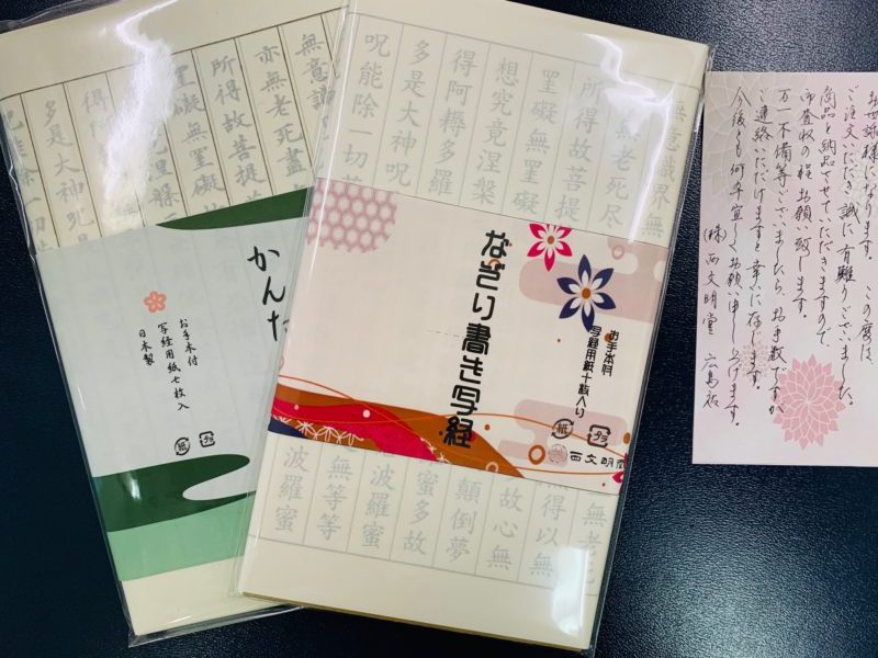 ネットで送料込みで1つ500円くらいの写経セット。しかも筆ペン付きです。筆ペンは本当に苦手なんですよ。でもこの機会にやってみようと思いました。これって小学高学年くらいから書けそうですよ。中学生や高校生なら写経にふれて国語や社会に興味がわくかも。ハマれば集中するし。私が書いた写経はまたブログに載せますね。