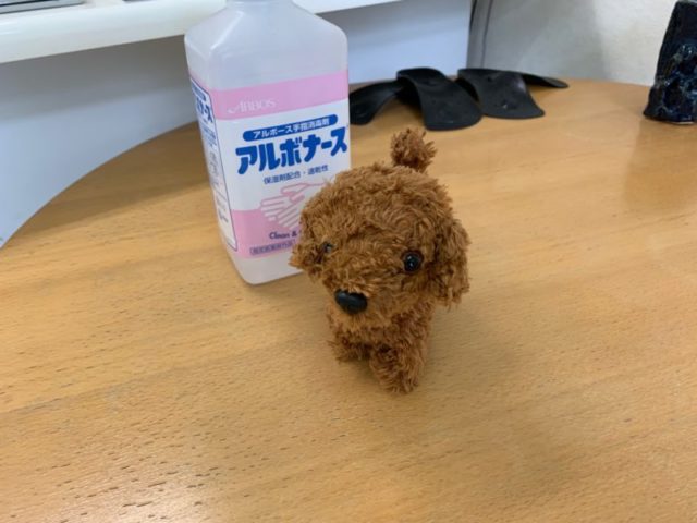 たまプラ整体院の看板犬のぬいぐるみのワンコさん。足が動かなくなったのでお客さんに修理をお願いしておりました。ダメ元で。